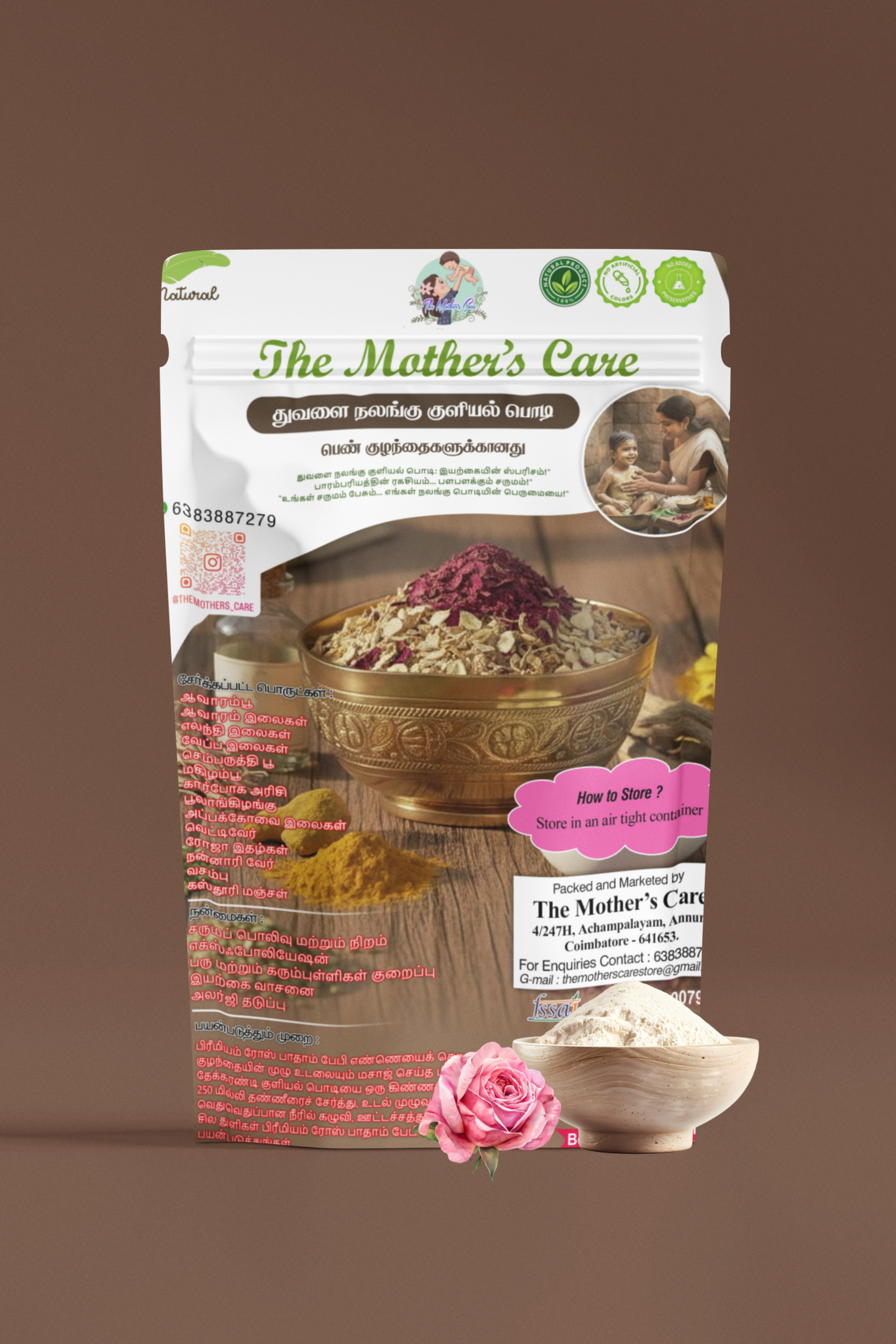 The Mother’s Care வழங்கும் துவளை நலங்கு குளியல் பொடி, பெண் குழந்தைகளின் மென்மையான சருமத்திற்காக பாரம்பரிய முறையில் தயாரிக்கப்பட்ட 100% இயற்கை மூலிகை கலவை ஆகும்.